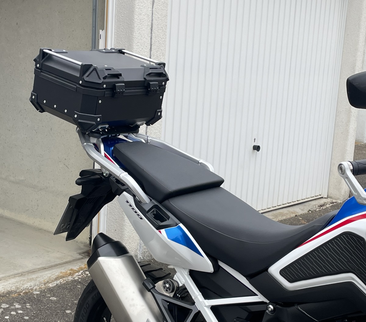 Die normalen Top-Boxen mit 35-45 l Inhalt waren mir zu groß und sperrig. Bei MOTEA fand ich eine kleine Alu-TopBox mit 22 l Inhalt und Abmessungen, die genau meiner Vorstellung entsprachen (40cm breit, 33 cm tief und 20 cm hoch). Das ganze absperrbar, 2 mm Alu und Adventure-Optik mit Verzurrösen.