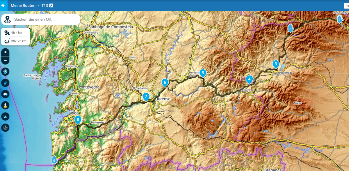 Zuerst entlang des Rio Luna, durch stille Täler mit karger Schönheit. Dann folge ich dem Rio Sil, der sich durch Kastilien gräbt, vorbei an Toreno. Dort wechsle ich kurz auf die Autovía, um zügig nach Ponferrada zu kommen – ein kurzer Sprung in die Stadt mit ihrer Templerburg, dann weiter westwärts.