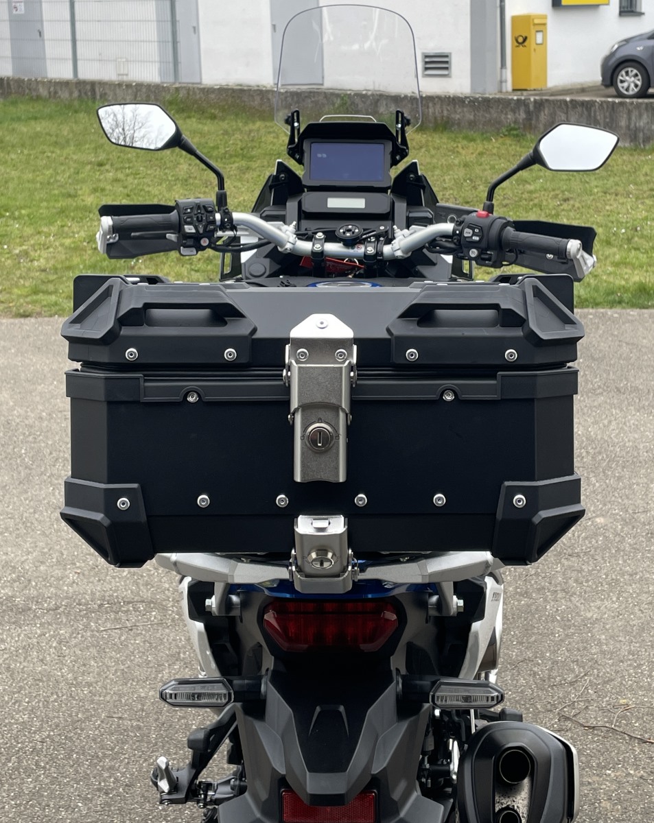 Die normalen Top-Boxen mit 35-45 l Inhalt waren mir zu groß und sperrig. Bei MOTEA fand ich eine kleine Alu-TopBox mit 22 l Inhalt und Abmessungen, die genau meiner Vorstellung entsprachen (40cm breit, 33 cm tief und 20 cm hoch). Das ganze absperrbar, 2 mm Alu und Adventure-Optik mit Verzurrösen.