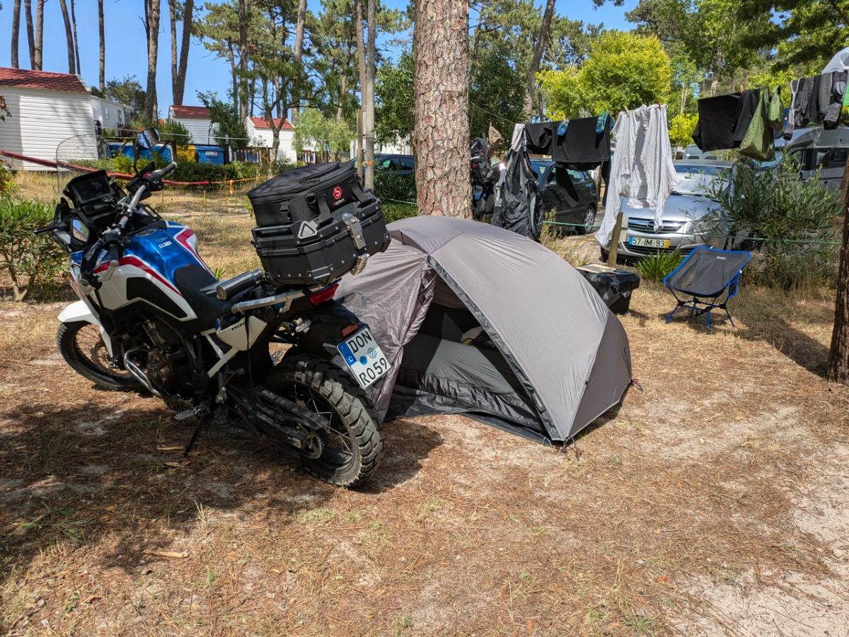Jetzt: Camping Orbitur Caminha. Ein Pinienwald direkt an der Mündung des Rio Minho in den Ozean. Der Boden duftet nach Harz und Meer. Die Geräusche – Wind in den Bäumen, Möwenrufe, ferne Brandung – mischen sich zu einer sanften Kulisse.
