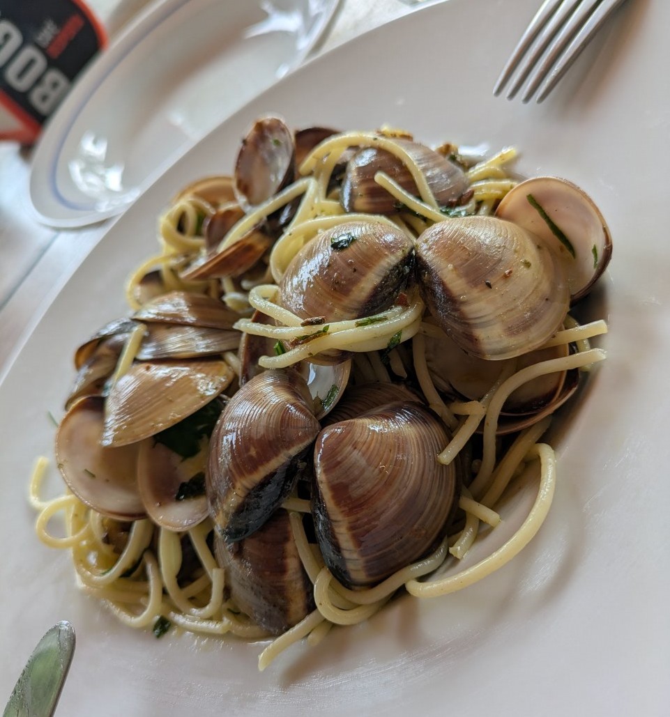 Das Essen im Camp-Restaurant war eine Überraschung: Spaghetti Vongole, wie man sie in Italien kaum besser bekommt. Frisch, würzig, auf den Punkt.
