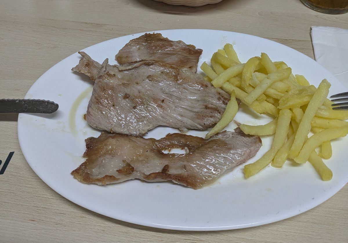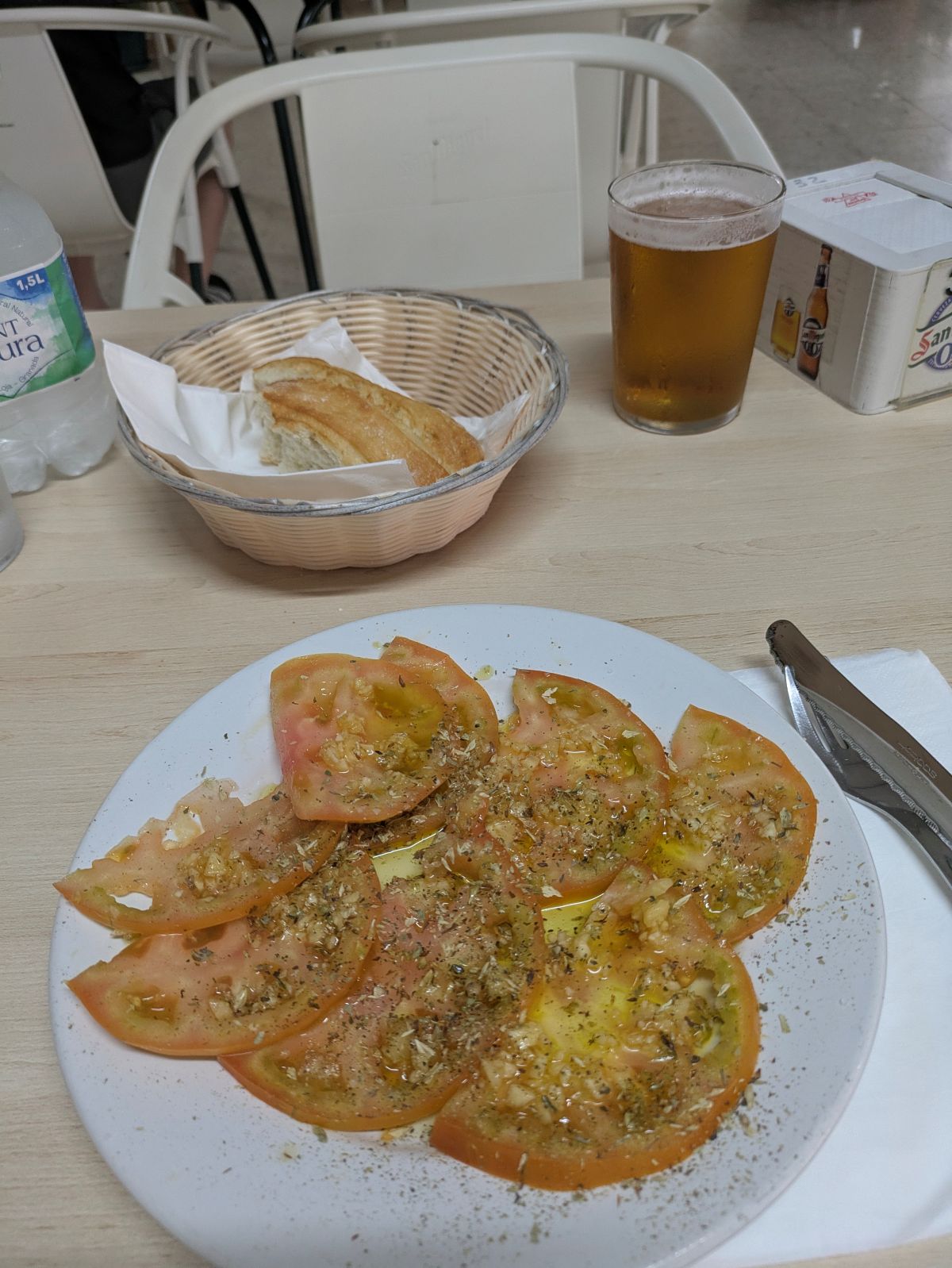 Untergekommen bin ich im Hotel La Barca bei Cartaya – klimatisiert, ruhig, genau das Richtige nach einem langen Tag in der Sonne. Ich hab ein Trucker-Hotel erwischt, das heißt: gute Zimmerpreise, Parkplatz im abgesperrten Hof und super Verpflegung: zum Abendessen gab es erstens 1/2 Tomate Alinado ( mit viel Knoblauch und Gewürzen in Öl und Zitrone) und als Hauptgang Secreto vom Ibericoschwein, ein Traum, Nachspeise gabs auch noch.